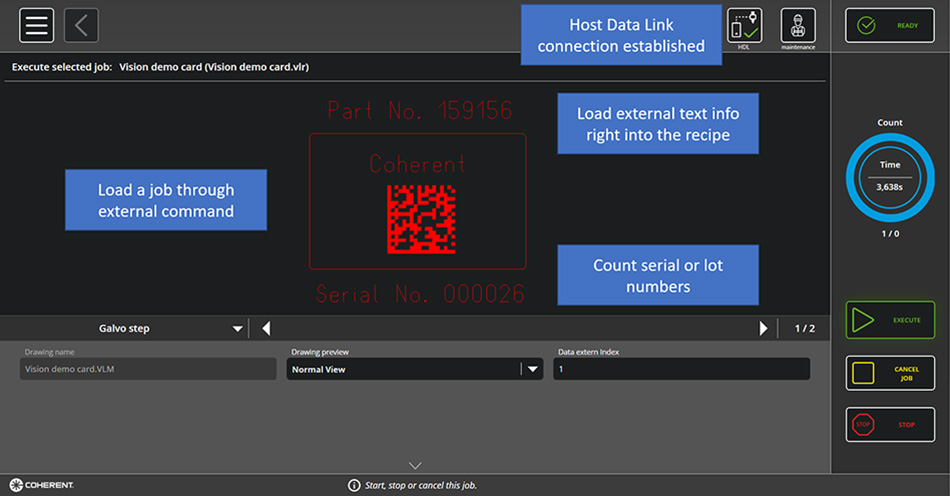 Laser FrameWork를 사용하면 다른 프로덕션 시스템에 레이저 머신을 연결하고 모든 종류의 데이터를 교환하는 과정이 간단해집니다. 이를 통해 호스트 또는 MES 시스템과 같은 더 높은 수준의 통제 시스템의 명령을 사용하여 작업을 통제하고 일련 번호와 같은 개인별 제품 데이터를 제공하고 추적 가능성 목적을 위해 데이터를 수집할 수 있습니다.