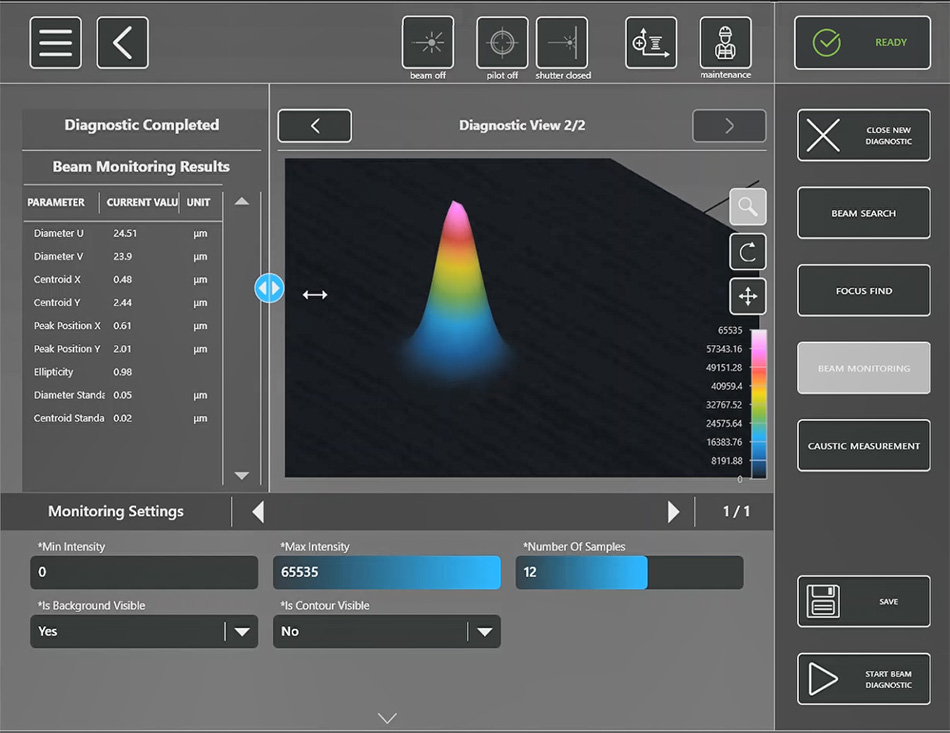 BeamInspect는 생산 워크플로에 고급 레이저 빔 진단 기능을 제공합니다. 정밀하고 자동화된 빔 매개변수 측정값이 생산 조정에 사용되며 모든 데이터는 공정 인증 및 추적을 위해 기록됩니다. 그리고 BeamInspect는 기계 내부의 실제 빔 초점 지점에서 이러한 측정값을 얻어내고 허리 직경, M², 빔 위치, 초점 위치 등에 대한 데이터를 제공합니다. BeamInspect는 고정밀 제품 제조에 필요한 엄격한 공정 품질을 유지하는 가장 쉽고 직접적인 방법입니다.