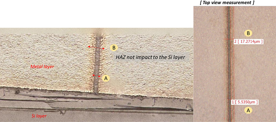 열영향부(HAZ)는 재료가 어떤 식으로든 열변형(예: 용융, 변형 또는 연소)이 되는 레이저 절단 또는 스크라이빙에 인접한 영역입니다. 웨이퍼 절단 로직 칩의 경우, 주요 위험은 모든 HAZ가 회로를 손상시키고 기능을 손상시킬 수 있다는 것입니다. 다행히도 HAZ는 레이저 펄스 에너지의 대부분이 주변 기판으로 흐르기 전에 절삭된 재료에 의해 제거되는 짧은 레이저 펄스를 사용하여 최소화할 수 있습니다.