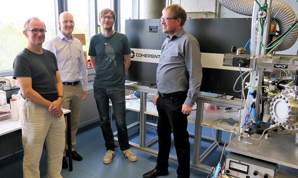 그림 1. (왼쪽부터) 칼 헬무트(Helmut Karl), 랄프 뎀다흐(Ralph Delmdahl), 플로리안 정(Florian Jung), 안드레아스 헤이만(Andreas Heymann)과 함께 찍은 아우크스부르크 실험실 사진 사진 제공: 아우크스부르크 대학의 칼(Karl) 교수