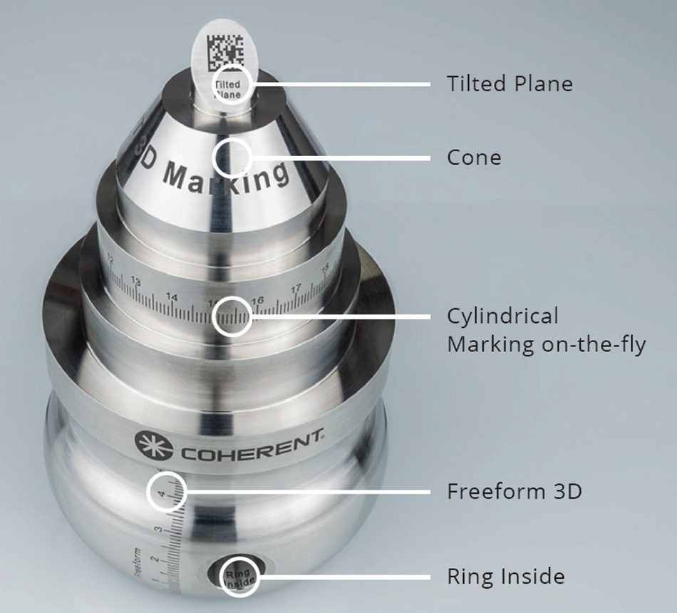 그림 1. 새로운 "스마트" 접근 방식으로 거의 모든 도형 또는 표면 방향은 물론 구멍과 삽입물 내부에도 마킹을 수행할 수 있습니다. 이러한 스텐레스 강철 예시에서는 초단파 펄스(USP) 레이저 기반의 Coherent 블랙 마킹 방법이 사용됩니다.
