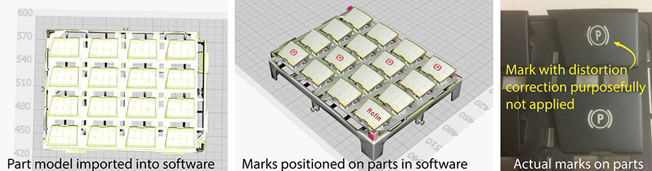 그림 5. Coherent의 SmartMap 3D 마킹 시스템을 활용하기 위해서는 부품의 CAD 모델을 소프트웨어로 가져오고 사용자가 원하는 마크를 부품에 배치합니다. 최종 결과는 공작물에서 올바른 마크 형상을 얻기 위해 왜곡 보정이 필요함을 보여줍니다.