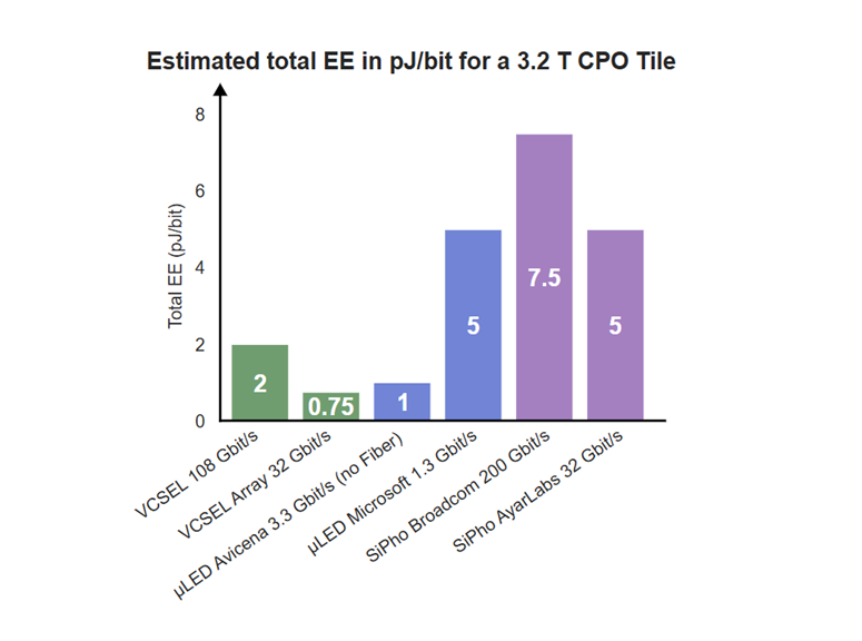 Energy efficiency is a defining metric for AI scale-up networks. A balanced wide-and-slow VCSEL CPO architecture — combining simplified electronics, reduced DSP, efficient drivers, and careful electro-optical co-design — has the potential to approach sub-1pJ/bit total link energy, end to end.